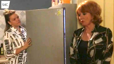 | Angharad gives him a can to drink in the shower |