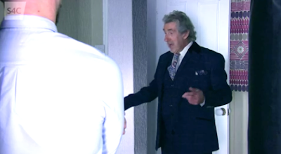 Garry is hobbling towards the Deri, and DJ tells him, “I think I’ve just been sacked! Eileen just flipped in there with Eifion and Hywel – then took it out on me. She’s obsessed – and her moods are up and down.”