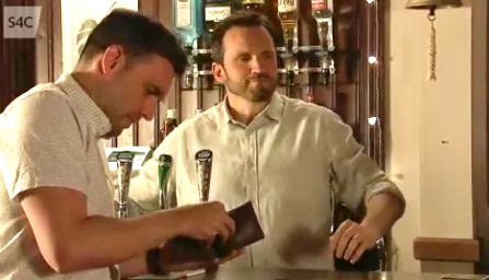 Eifion tells Mathew that the drink is on the house, and he is surprised that Eifion is allowed to do that.