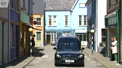 Some time later, outside the Deri in the sunshine, Mark is glad that they did not have to go to the cemetery; “I hate funerals!” Hywel says that he does not know anyone who likes them, which makes Tyler chuckle.