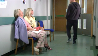 At Penrhewl, Sioned is drinking a cup of tea when Britt arrives; Sioned explains that DJ is doing some work there and her mother has taken Huwi to Meithrin [nursery]. “You’re here earlier than usual,” she says, and Britt points out that they have a lot of orders today.