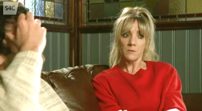 He goes upstairs, leaving Kelly weeping alone on the sofa.
