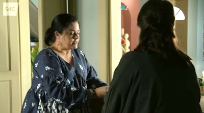 Delyth and Maya having breakfast in the pharmacy flat; “Do you want to talk?’ asks Maya, but then a text arrives on Delyth’s phone.