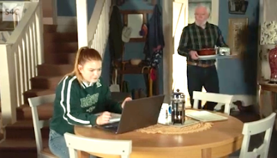 Siôn will warm up some cawl for the two of them and she sarcastically comments, in English, “Nice one, Siôn!”