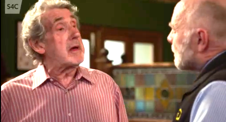 “Why didn’t you phone to say you were coming home?” Siôn demands. Iolo replies that Greta wanted to surprise Tad-cu.