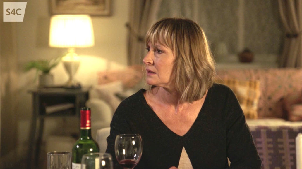 “You’ll never guess whose voice I heard at Y Felin – Eileen,” she announces, much to DJ’s displeasure.